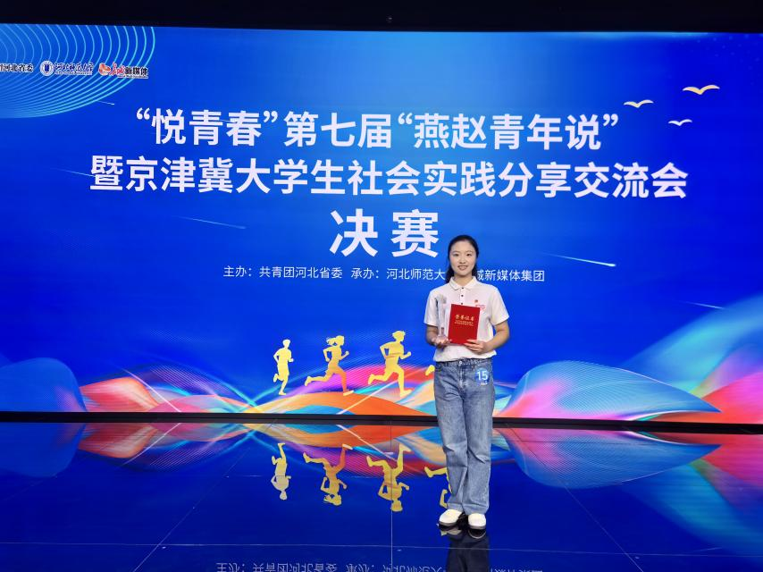 9月29日,“悦青春”第七届“燕赵青年说”暨京津冀大学生社会实践分享交流会在河北师范大学圆满落幕。本次大赛由共青团河北省委主办,河北师范大学与长城新媒体集团联合承办,全省各高校共同参与。我院学子任珈乐凭借出色表现,以总分第一的优异成绩荣获一等奖。